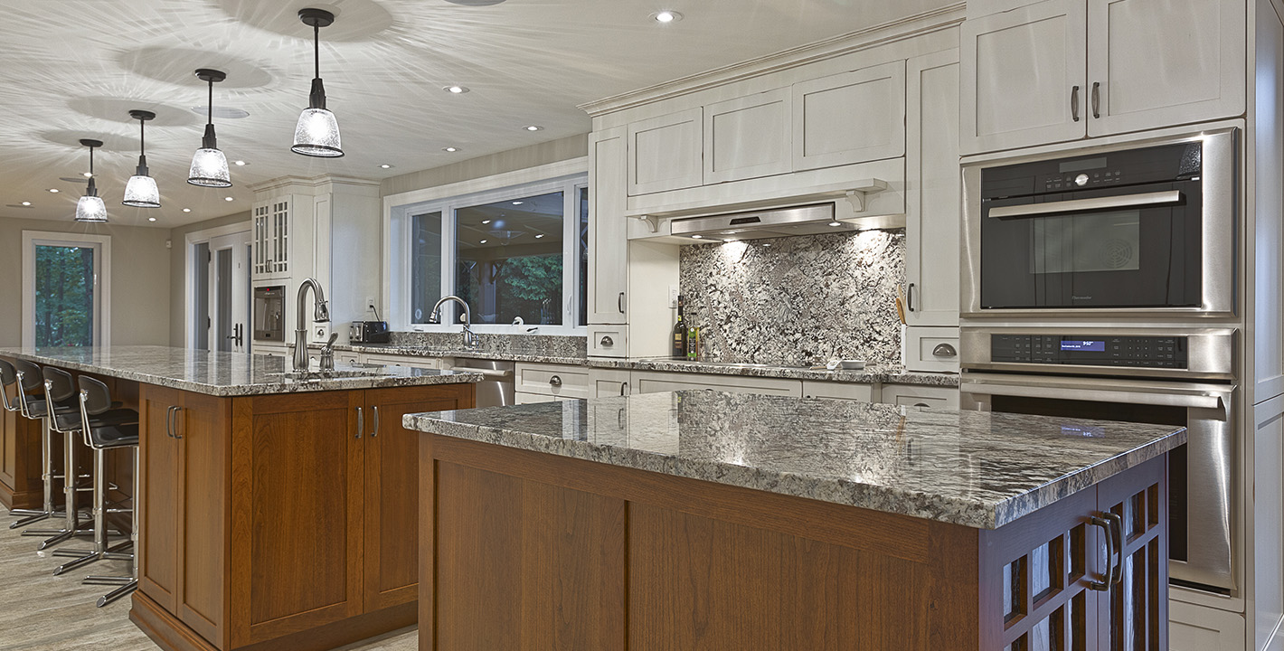 Cuisine classique avec comptoir de granit. Portes de style shaker en bois et laqué blanc, four encastrée et plaque de cuisson intégrée.